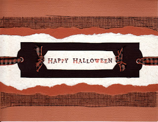 I decided to keep the cards similar by using the same papers and colors. The first card uses some black mesh material. I used orange ink on the happy halloween, and tapped some black ink here and there. A simple tag die cut, with some eyelets (remember those?) and checked ribbon complete the look.